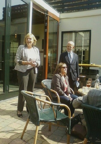 Op het terras van De Pynas hebben we nagepraat en na een tijd hartelijk afscheid genomen van onze collega van toen, met de aanbeveling om nog eens de gemeente te bezoeken. Maar daarvoor was er nog een ledenvergadering van meer dan 1 minuut: een woord bij een overleden collega, de toevoeging van Harrie Kampf als webmaster aan het bestuur, en de uitslag van de gehouden enquête onder de leden. Penningmeester Corrie Hoekstra herinnerde aan de nog te betalen contributie (15 euro).!!